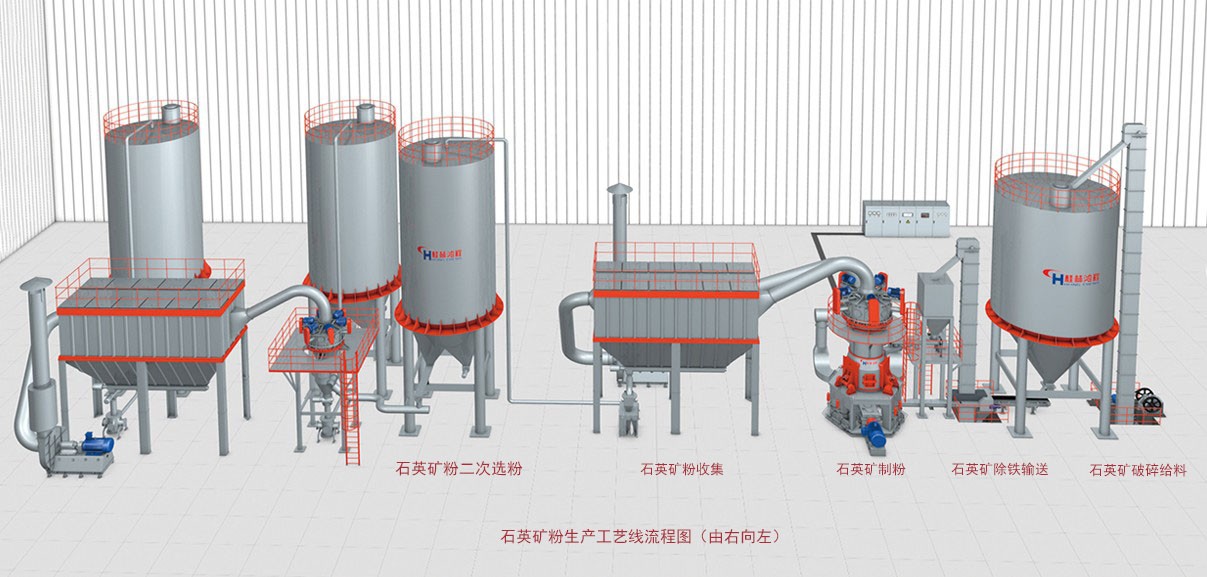 石英礦粉生產(chǎn)工藝線流程圖展示從石英礦礦石破碎、石英礦礦石提升存料、石英礦礦石輸送定量給供料進(jìn)入磨粉機(jī)、石英礦礦石磨粉、石英礦礦石磨粉選粉、石英礦礦石粉體收集...